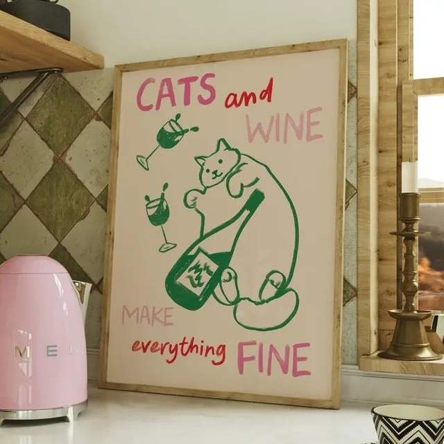 Cats and Wine Kitchen Print! This on-trend, unique design is printed onto 250gsm Matte Premium Paper, using top of the range, pigmented inks to