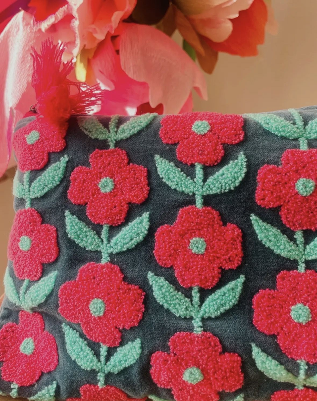 The ultimate accessory to make your life more organised, designed to last season after season. The cotton velvet clutch bag is a versatile, generously sized daily essential. The streamlined style can be carried along as a clutch or slipped into a larger handbag to keep your valuables extra secure. A hard working design created to stand the test of time, developed through a bespoke production process from durable cotton velvet which features a intricate embroidery design. . Velvet Multiflowered pattern pouch with stitched detail and tassel on zip . Available in two sizes . Small Size Dimensions: 11 x 16.5cm . Large Size Dimensions: 17 x 25.5cm . Colour: Grey/Pink . 100% cotton velvet . Embroidery detail . Zip closure with tassel