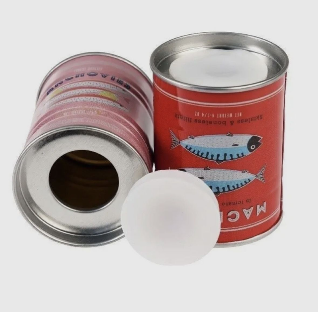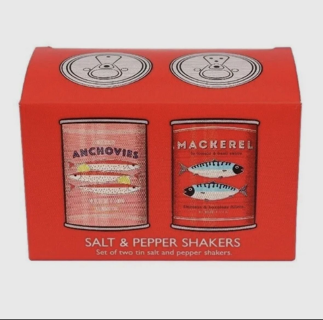 A pair of metal tin salt and pepper shakers with mackerel and anchovy fish branding. Matching storage tins also available. • Store in a dry place • Hand wash only